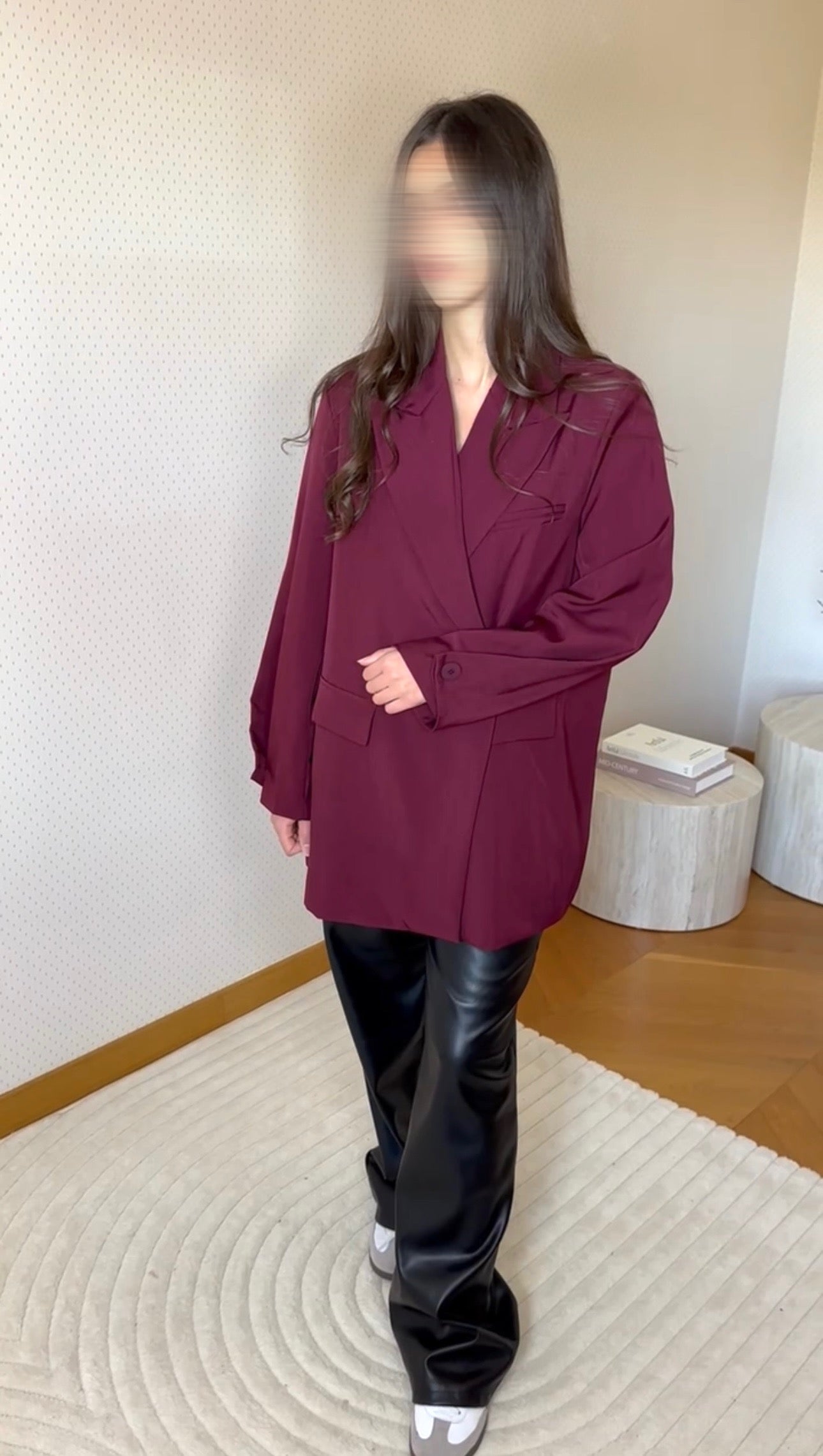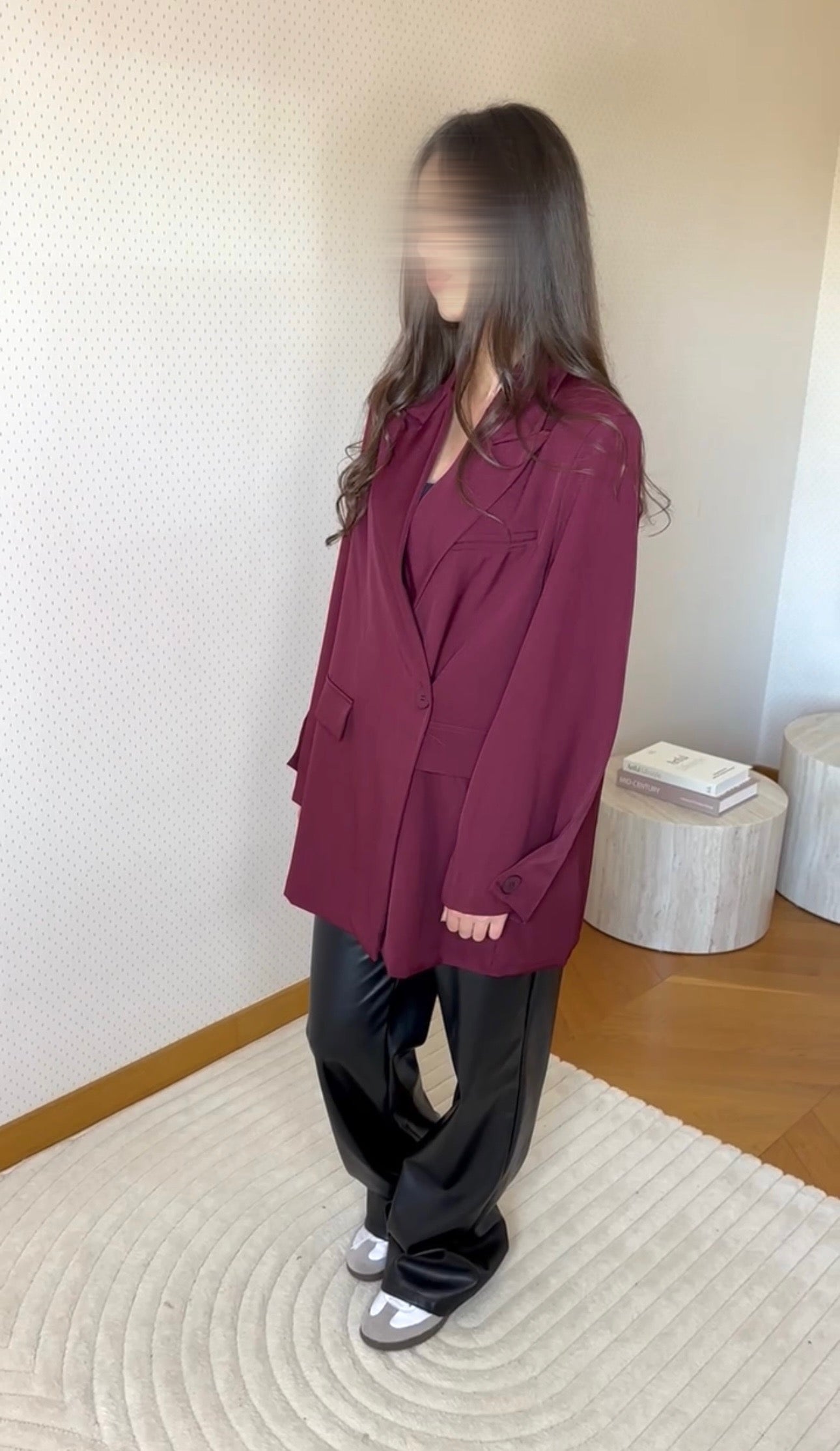 Chic et audacieux, ce blazer bordeaux se distingue par sa teinte profonde et sa coupe moderne. Le bouton ton sur ton situé sur la manche vient souligner son élégance et sa finition soignée. À porter sur un pantalon droit ou une jupe longue pour une allure affirmée et raffinée.