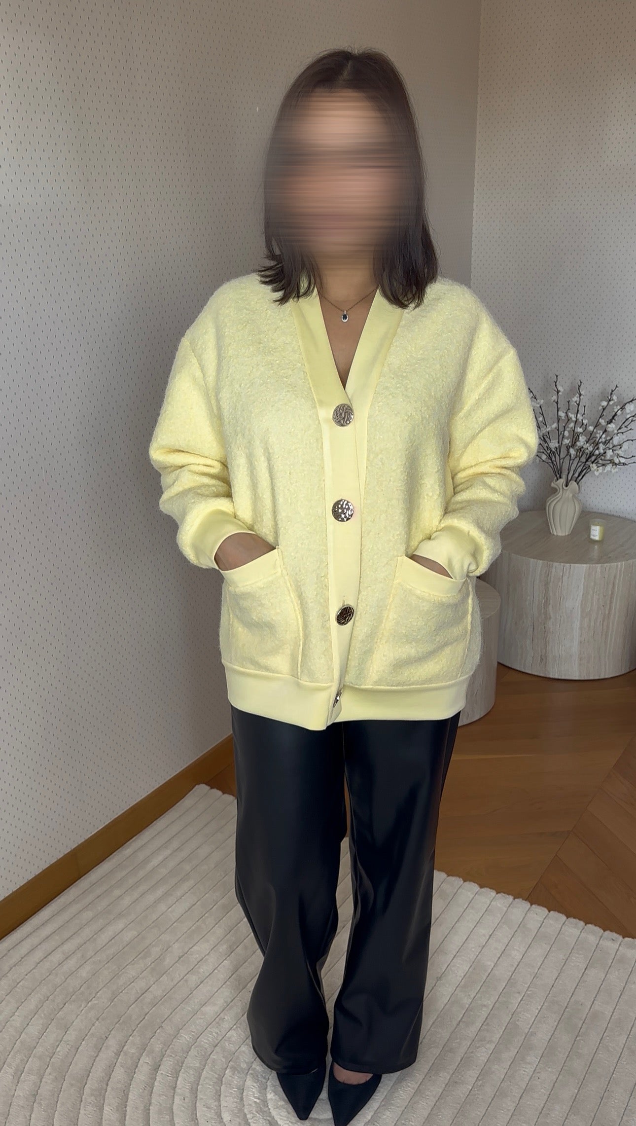 Lumineux et facile à porter, ce cardigan jaune pastel apporte une touche douce et fraîche à la silhouette. Sa matière texturée offre un rendu confortable et chaleureux, tandis que la coupe droite et les boutons décoratifs structurent l’ensemble avec élégance. Un cardigan femme idéal pour illuminer une tenue sobre ou compléter un look plus habillé, au quotidien comme en demi-saison.