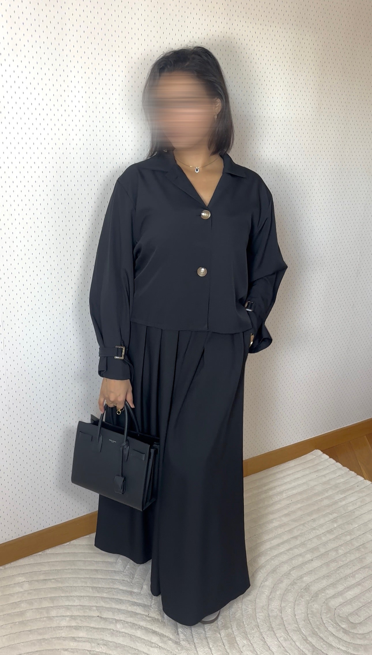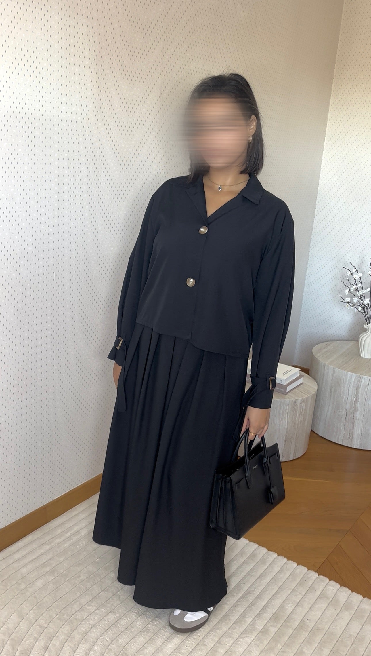 Chic et intemporel, cet ensemble noir composé d’une jupe plissée longue et d’une chemise manches longues à boutons est une pièce incontournable du dressing élégant. Sa coupe fluide et structurée met en valeur la silhouette tout en assurant un confort optimal. Facile à associer, il se porte aussi bien pour un look professionnel raffiné que pour une soirée. Un must-have du modest fashion pour un style sobre et sophistiqué.