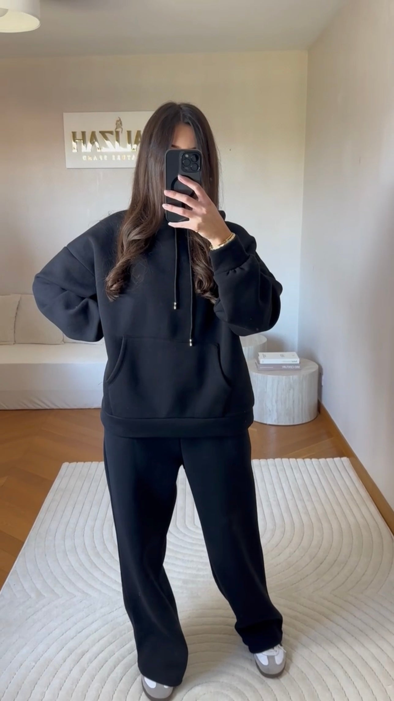 Intemporel, cet ensemble jogging noir associe confort et style. Sa matière chaude et douce assure un bien-être absolu, tandis que sa coupe fluide et équilibrée en fait une tenue polyvalente, parfaite pour un look urbain, cosy ou voyage.