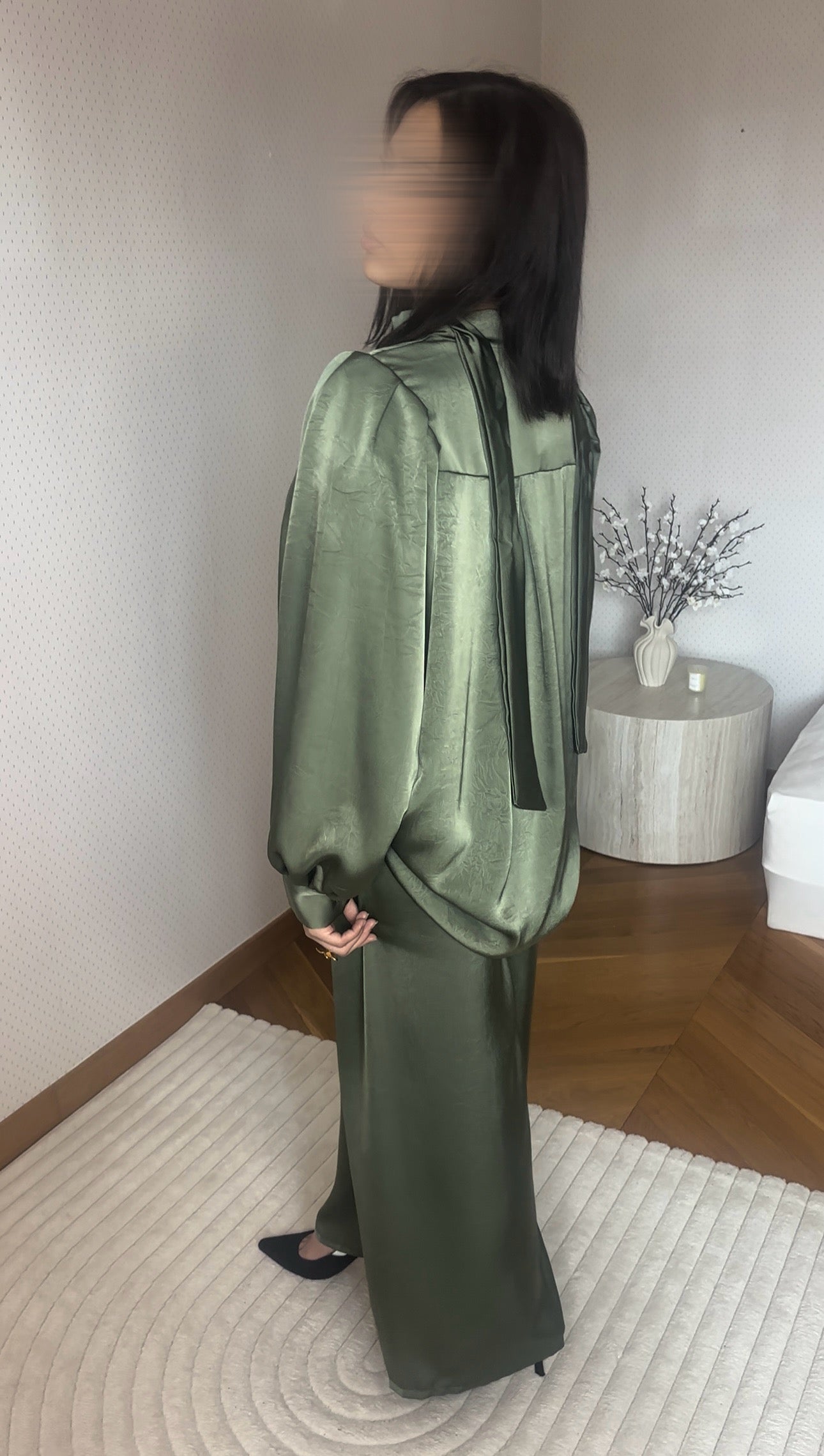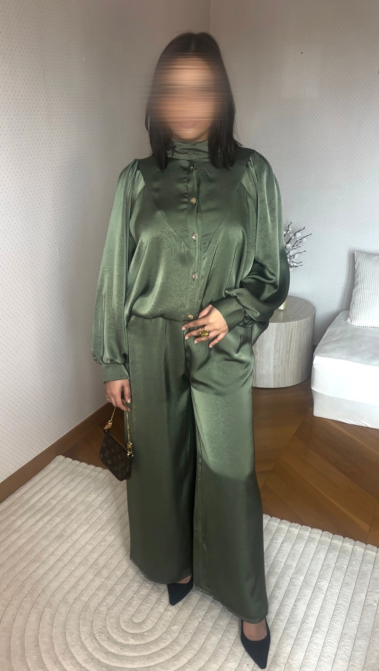Ensemble satiné kaki, pensé pour s’adapter à vos envies et à votre style. Composé d’une chemise fluide et d’un pantalon large assorti, il offre une allure élégante et mastour, idéale aussi bien au quotidien que pour des occasions plus habillées.