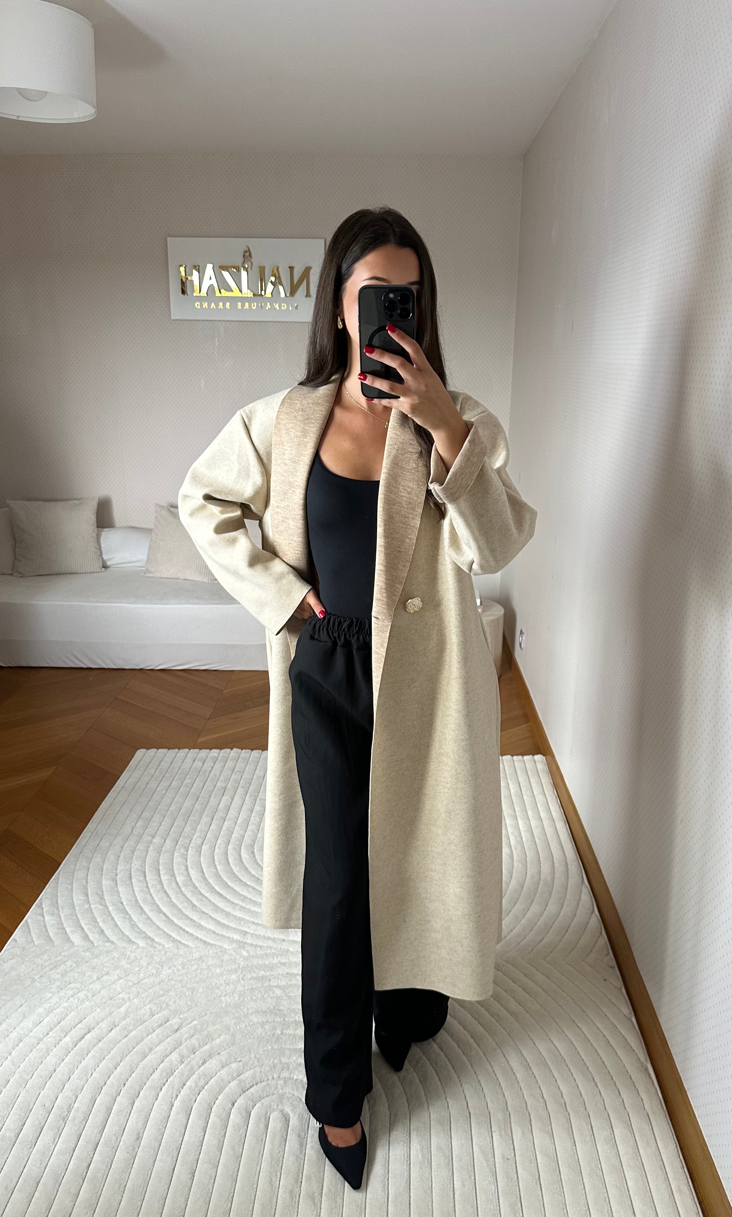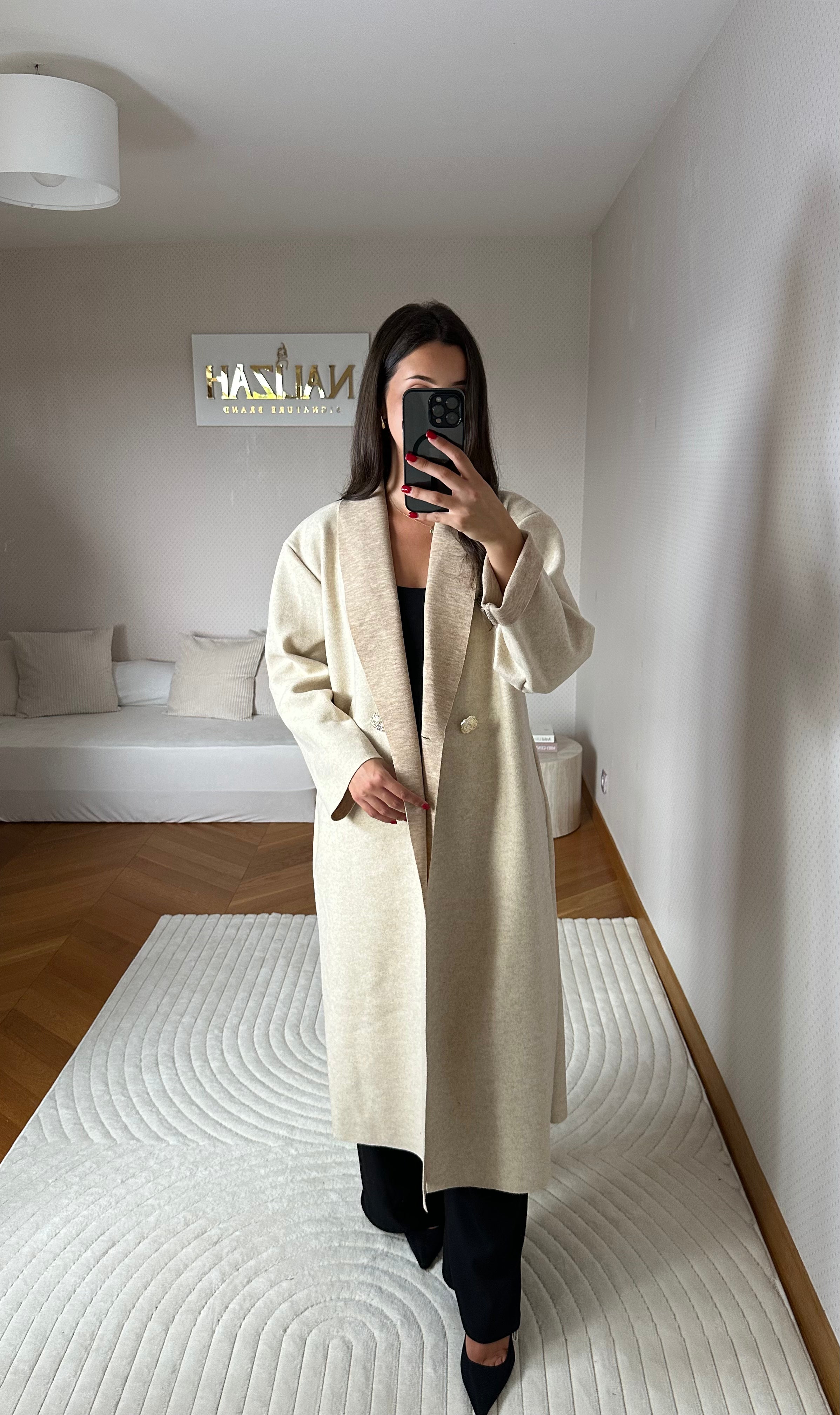 Chic et intemporel, ce manteau long beige apporte élégance et confort à vos tenues. Sa coupe fluide et son col large en font une pièce raffinée qui se porte facilement au quotidien comme lors d’occasions plus habillées. Un indispensable du dressing féminin, parfait pour un look sophistiqué en toute circonstance.