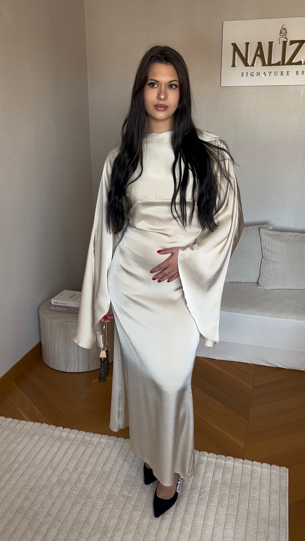 Délicate et lumineuse, cette robe longue beige séduit par son tissu satiné au fini soyeux et son tombé fluide qui accompagne naturellement les mouvements. Le col légèrement drapé et la structure subtile à l’avant apportent une élégance discrète, tandis que les manches longues fluides renforcent l’allure raffinée de la pièce. À l’arrière, la robe est dotée d’un corsage ajustable, permettant de marquer la taille selon la morphologie et d’offrir un ajustement personnalisé tout en conservant un tombé élégant.