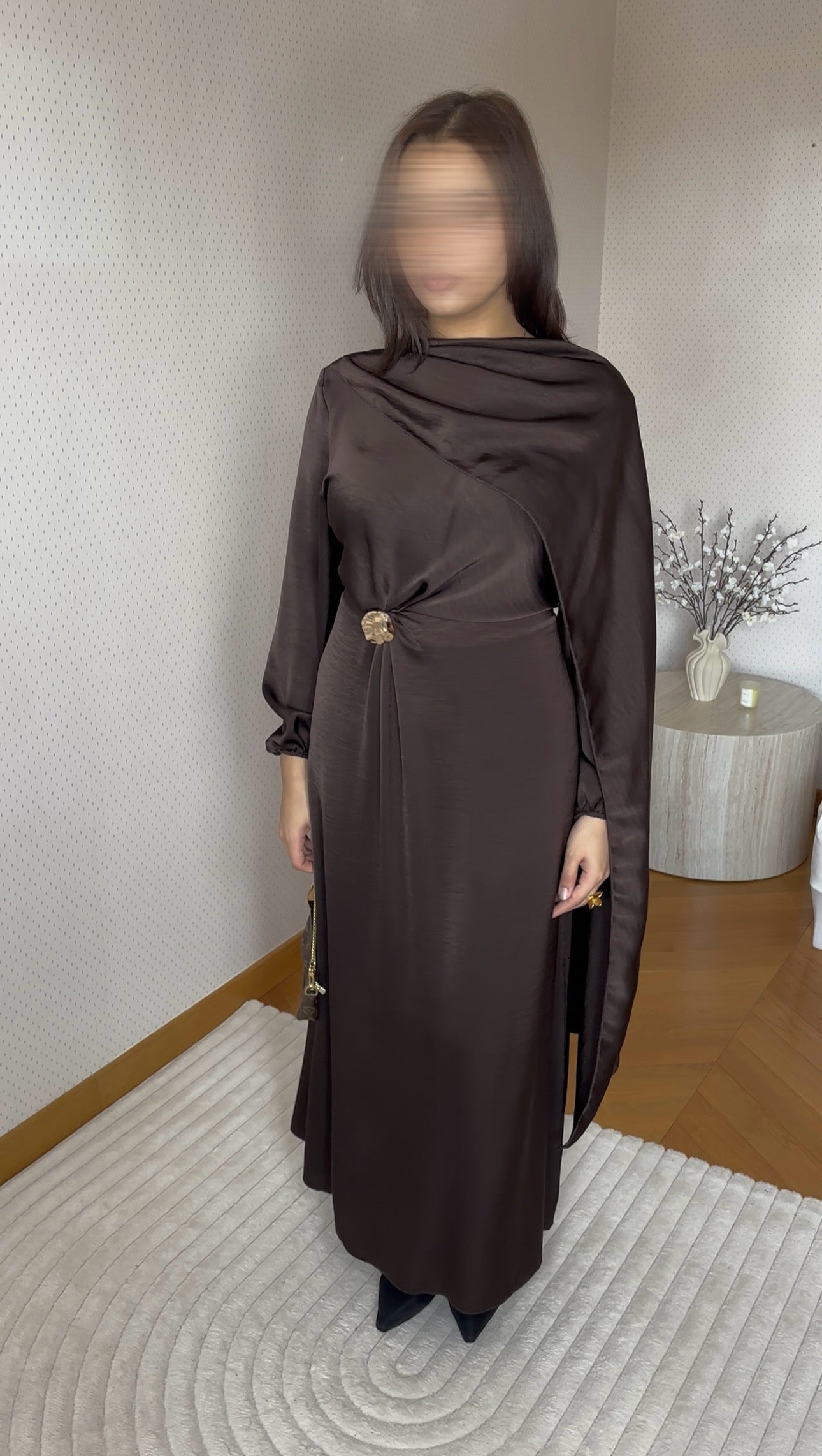 Chic et enveloppante, cette robe longue marron se distingue par son voile fluide qui traverse le buste et se déploie délicatement dans le dos, apportant une allure sophistiquée et structurée. Sa matière satinée offre un tombé élégant et une finition lumineuse, tandis que la robe se resserre à la taille grâce à un nœud ajustable dans le dos, permettant d’adapter la coupe et de mettre en valeur la silhouette. Une pièce au caractère affirmé, idéale pour une tenue habillée au style intemporel.