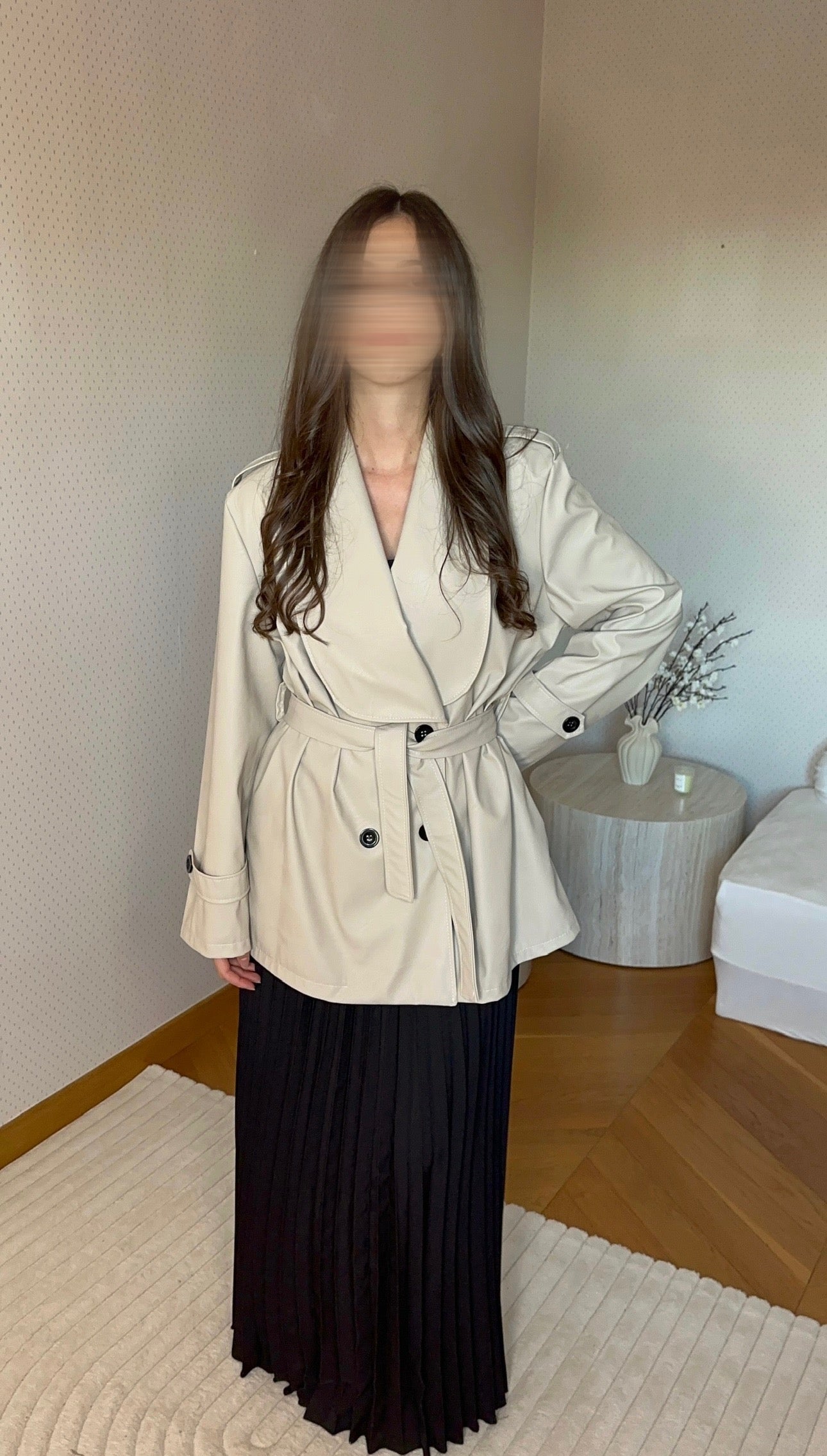 Chic et contemporain, ce trench court beige en similicuir se distingue par son design épuré et sa ceinture ton sur ton qui souligne délicatement la taille. Sa texture douce et légèrement brillante confère un style moderne et élégant, idéal pour rehausser vos tenues du quotidien avec une touche de caractère.